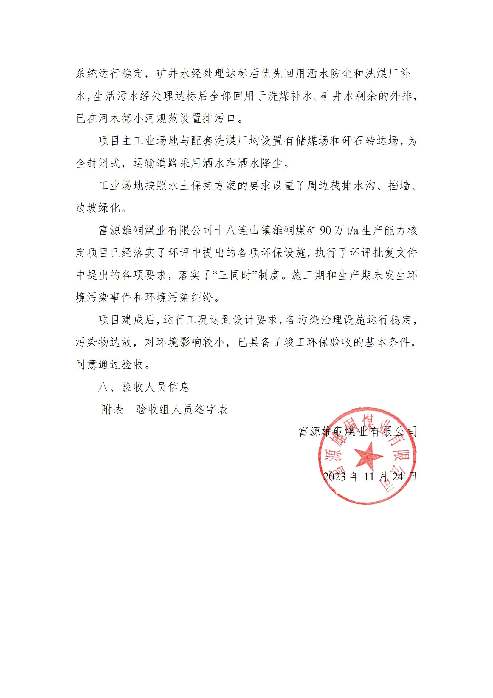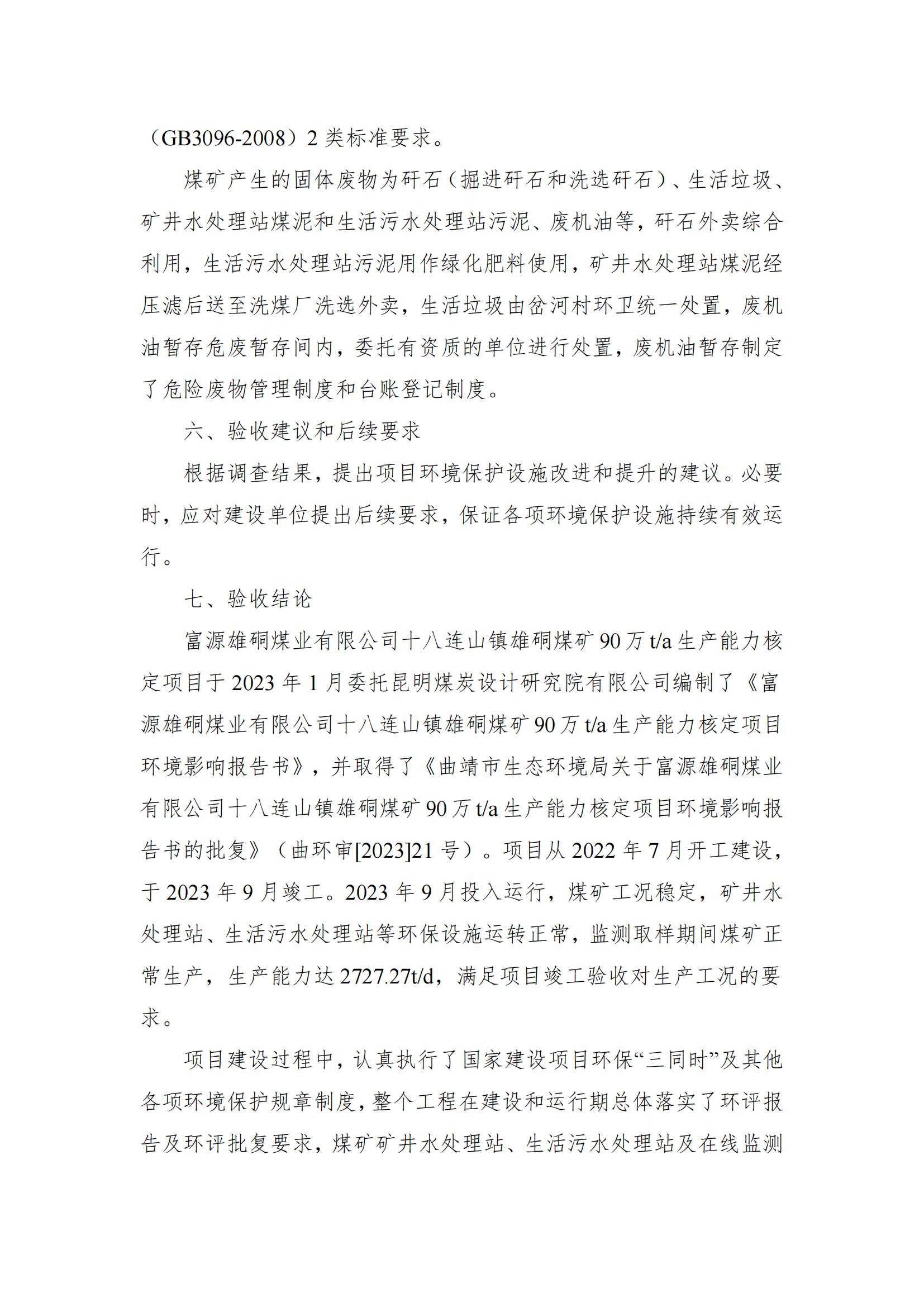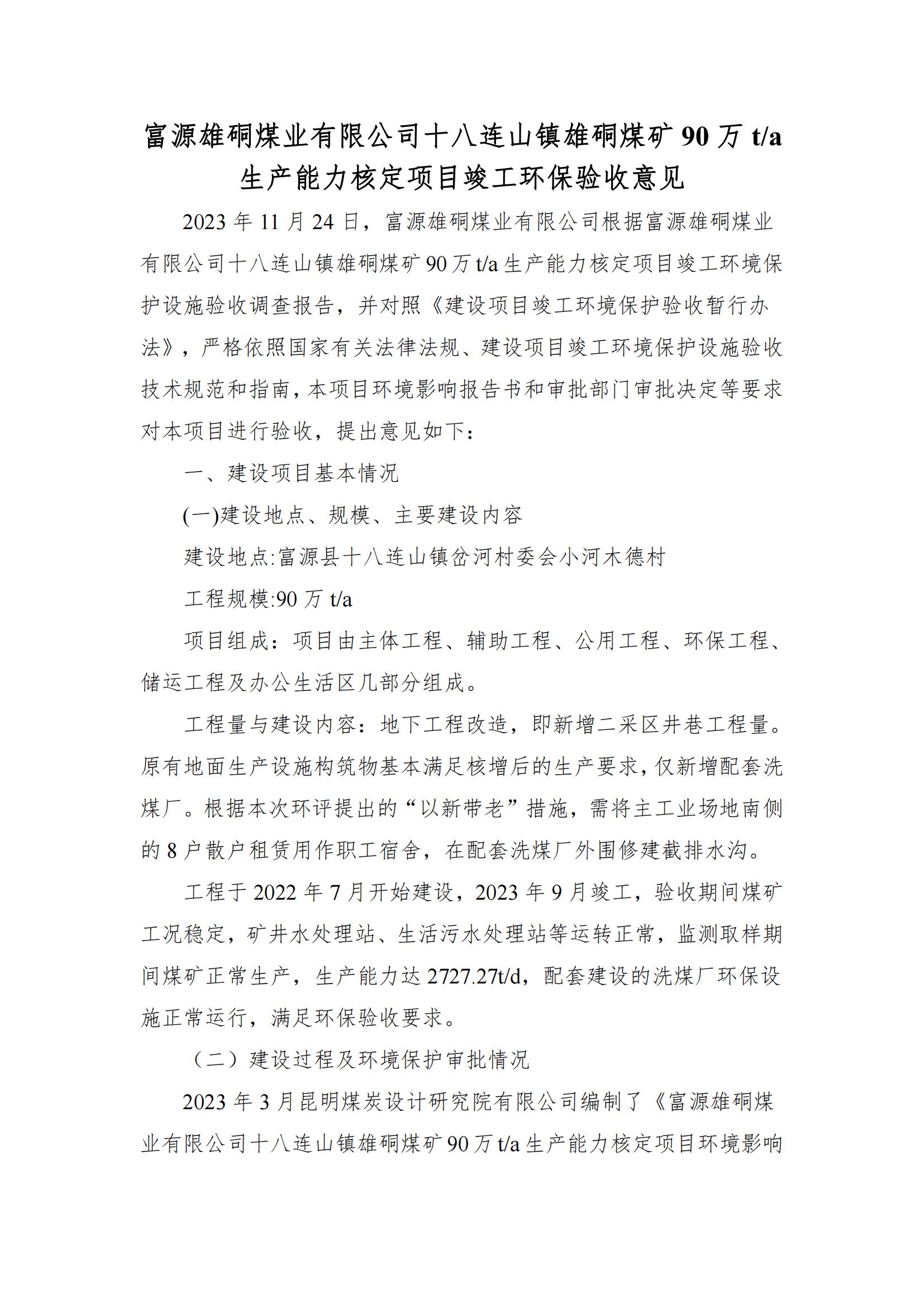 富源雄硐煤業(yè)有限公司十八連山鎮(zhèn)雄硐煤礦 90 萬 t/a 生產(chǎn)能力核定項目竣工環(huán)保驗收意見